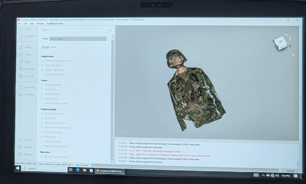 I will read some more about how I can de-corrupt my file in Artec studio. It appears that they have a few processes in place to do so. But it was going to be an absolutely massive file – something north of 10gb if not far more. For reference, the nurse’s cap above is ~45mb. I think I’ll be able to recover the file, and hope that I do, as I think there will be some procedural learning to be had from it.