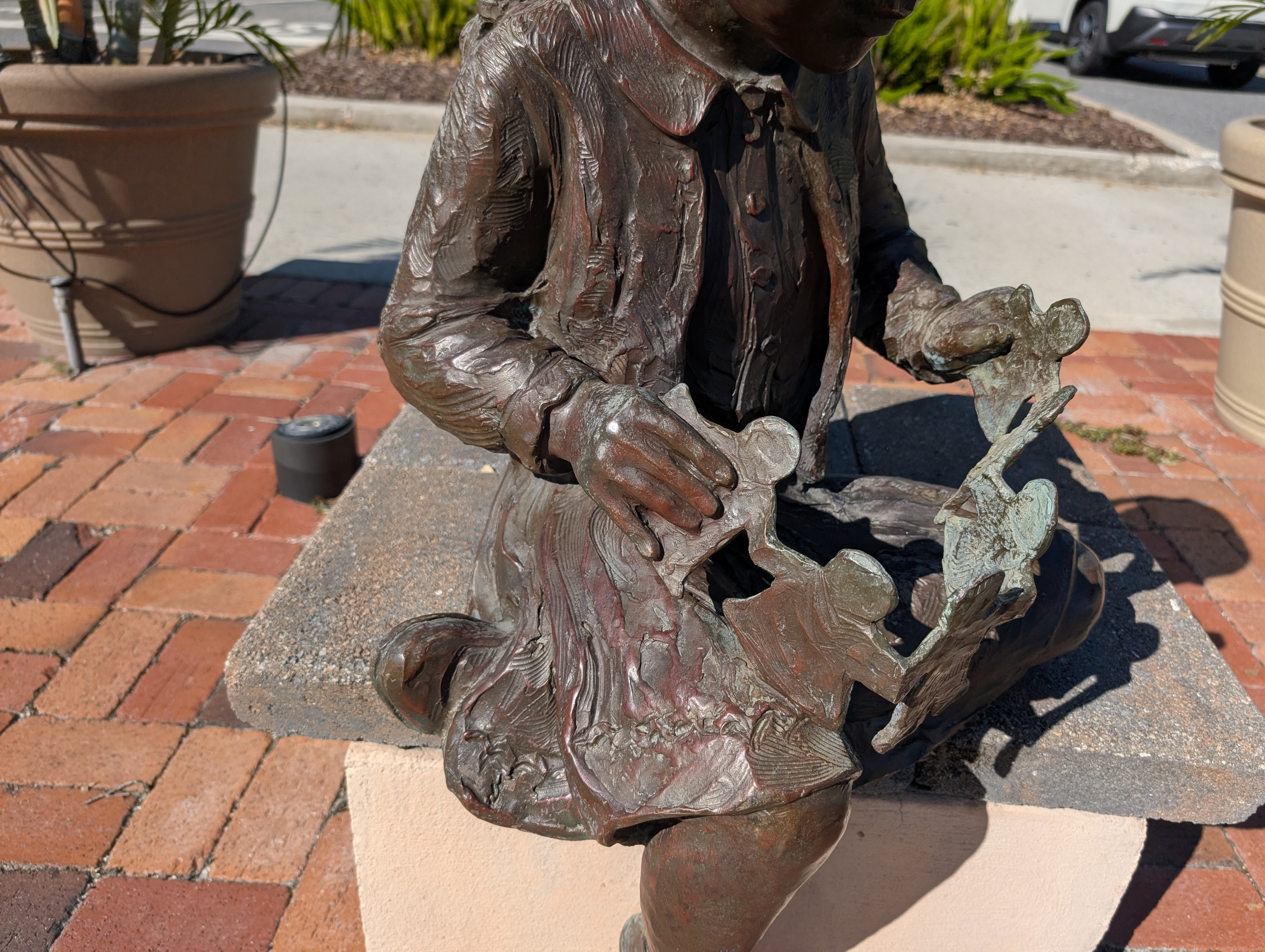 Jane DeDeckler is an artist who specializes in bronze statues, and is particularly focused on sculptures depicting families and children. I found a match for the statue of the girl with paper dolls on her website. She has statues dedicated to honoring several prominent women including Harriet Tubman, Emily Dickenson, Ida B. Wells, and many more. She has been named as one of the artists who is going to work on an upcoming Women’s Suffrage National Monument in D.C., so she is very clearly interested in depicting women and girls, which makes the juxtaposition in this curated set of statues very curious.